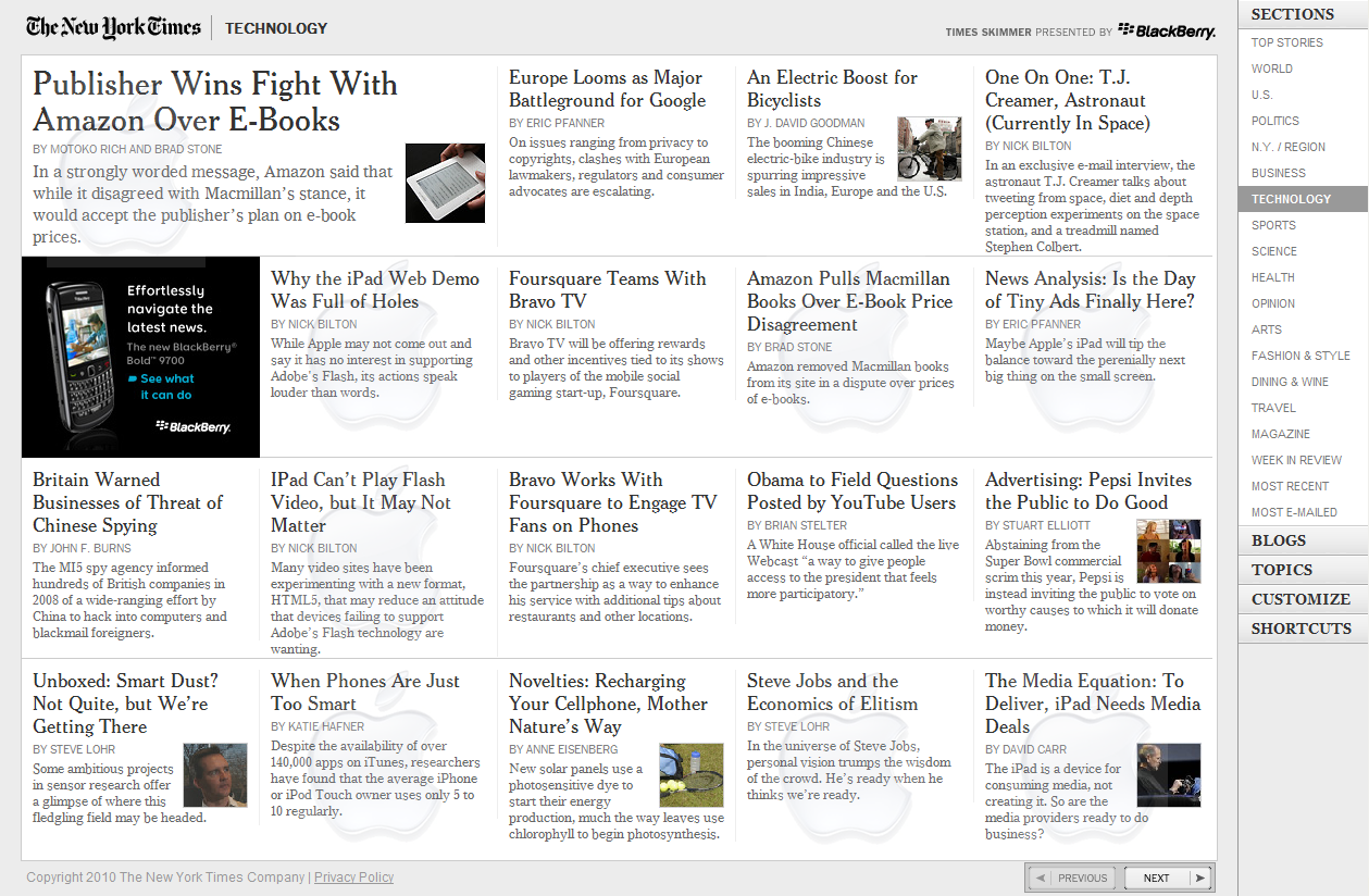 I was amused by how Apple totally took over Technology reporting in the days preceding the iPad launch. A screenshot from the Times Skimmer coverage from Feb-4-2010. Even the stories that weren’t about the iPad, like the Mcmillan disagreement with Amazon were influenced by the release. Oh…and by the way,the page is sponsored by Blackberry! 🙂
