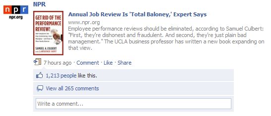 This morning I caught this post on facebook from NPR which drew quite a response. Other posts on NPR’s feed such as Zombies And Giant Squid: Summer’s Monster Hits! or Spy Exchange Would Be A Cold War Flashback draw on average a couple of hundred “Likes” and 50 to 100 comments. The post Annual Job Review Is ‘Total Baloney,’ Expert Says at this time has drawn 1213 Likes and has 265 comments. And you guessed it…most people hate the Performance Review.